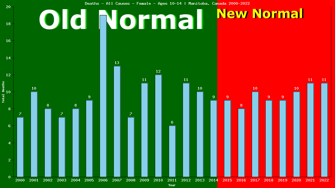 in deaths from All Causes among girls aged 10-14 living in Manitoba in the New Normal™, as compared to the Old Normal.