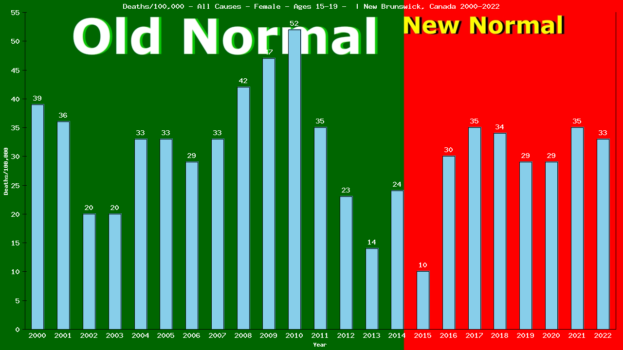 in deaths from All Causes among teen-aged girls aged 15-19 living in New Brunswick in the New Normal™, as compared to the Old Normal.