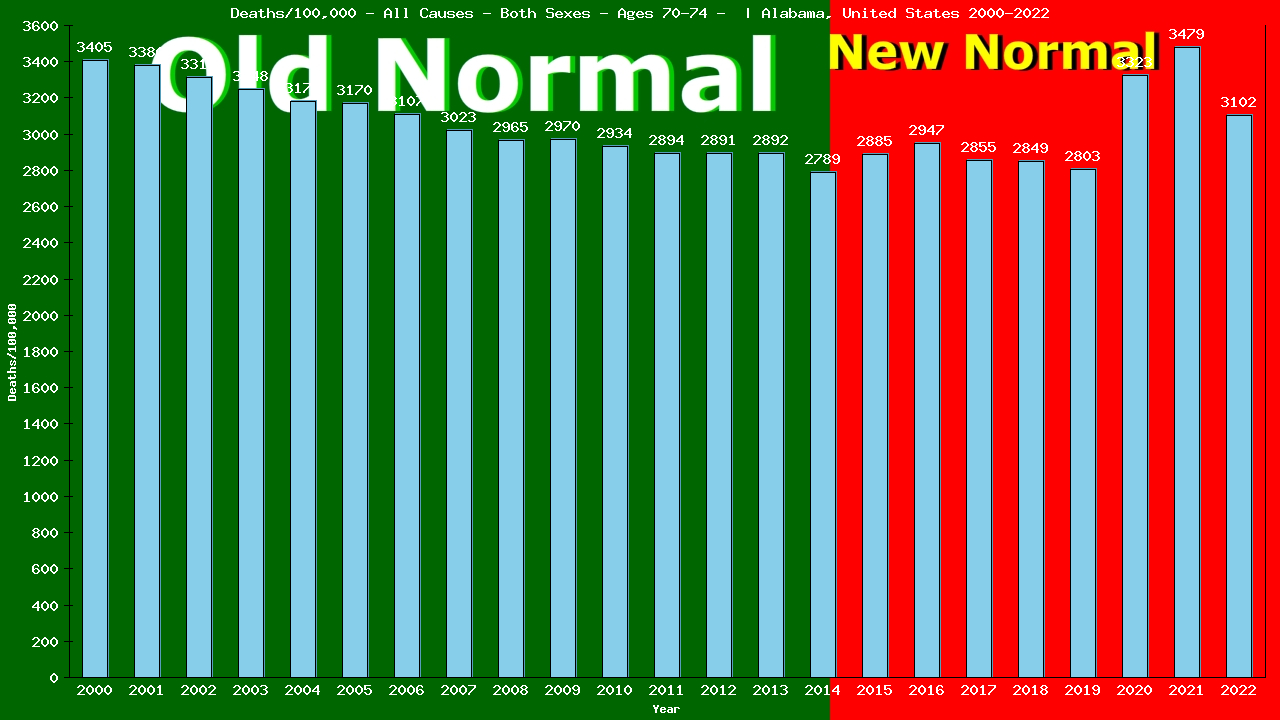 The table shows there were a total of 72,595 deaths from All Causes among 2,367,398 elderly men and women aged 70-74 living in Alabama in the 15 years immediately prior to the New Normal™.