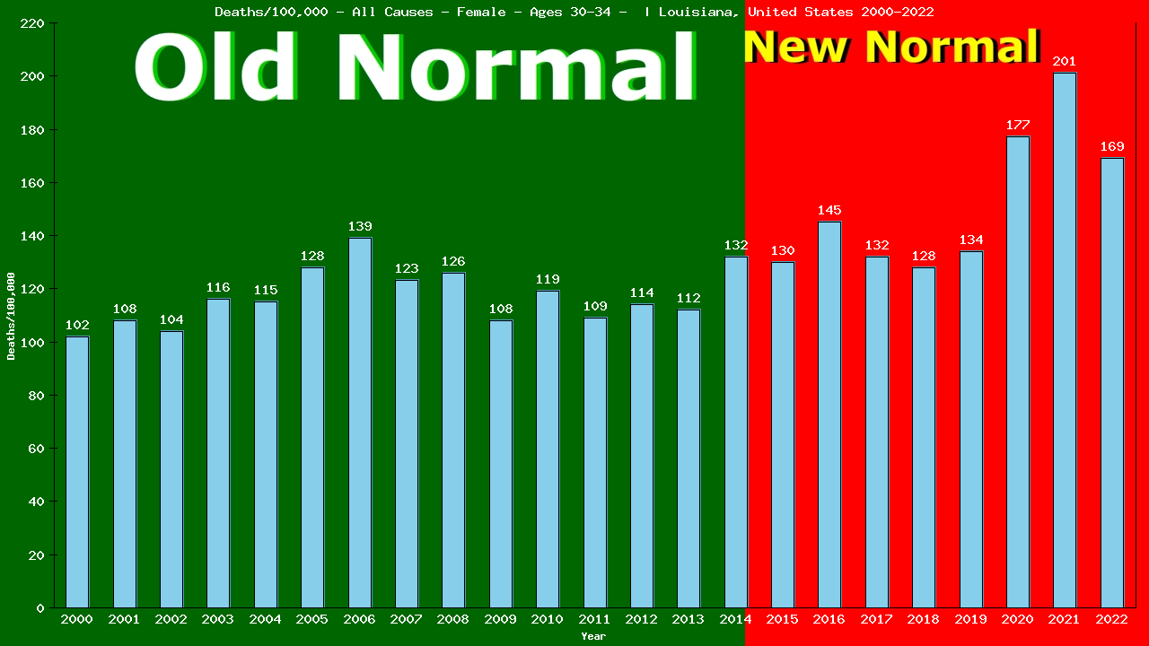 This reveals 84 lives lost and is 143.57% of what we expected (an increase of 44%) in deaths from All Causes among women aged 30-34 living in Louisiana in 2022, as compared to the Old Normal.